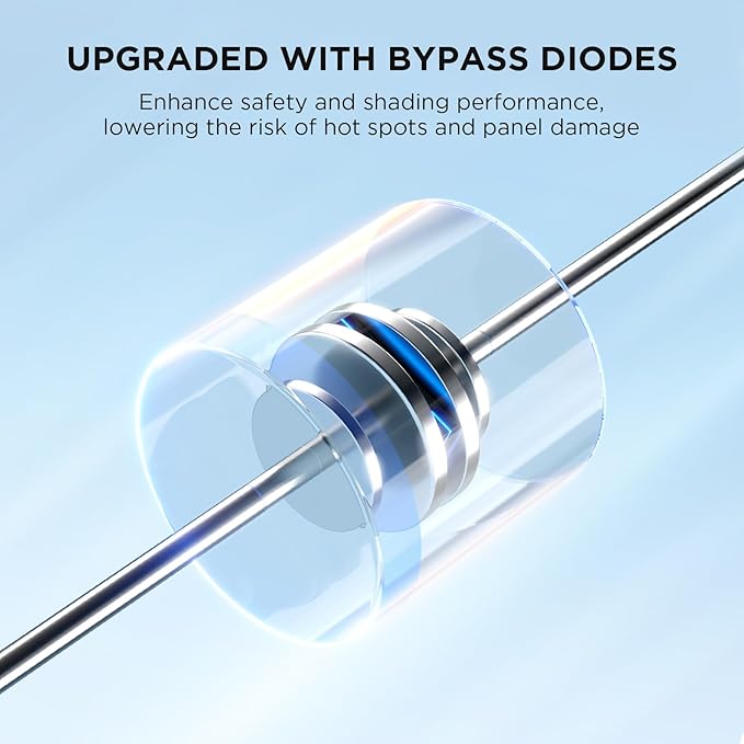 - 【Advanced Bypass Diodes for Shading Resistance】Stop worrying about partial shadefrom trees or clouds. Our upgraded bypass diodes protect cells from overheating (Hot-spots)and minimize power loss by bypassing shaded areas. This ensures stable, safe, and continuous energy output for your outdoor adventures