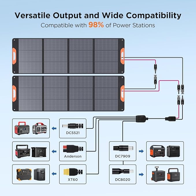 - 【5-in-1 Versatile Connectivity】Equipped with a professional 5-in-1 solar connector(XT60/DC5521/DC7909/DC8020/Anderson), this foldable solar charger is compatible with 98%of portable power stations on the market. Perfect for building a reliable off-grid power systemwith your existing solar generators
