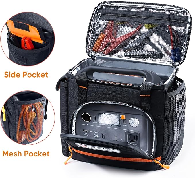 - 【MULTIPLE POCKETS】This carrying bag has multiple pockets for Jackery accessories. In addition to the main power compartment, there is also a large mesh pocket on the top of the compartment, two side pockets, and a front pocket. Allows you to store charging cables, adapters, chargers, or other accessories more conveniently.