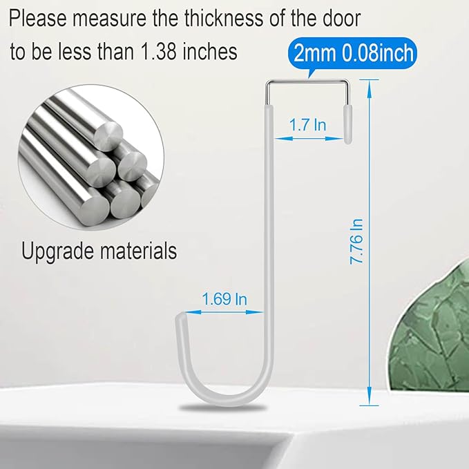 - Product size: over the door hook is suitable for door thickness range 1.7", the door hook is 7.76 inches from the top of the door. Please measure your door thickness to be less than 1.7 inches before placing an order. Please make sure there is a coin (0.08 in) gap on the door.