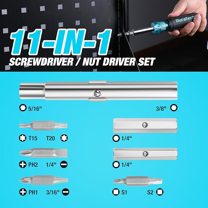 - ULTIMATE 11-IN-1 MULTI-SCREWDRIVER: Features 8 essential screwdriver bits and 3 nut drivers (1/4", 5/16", 3/8") for versatile use. Includes Torx: T15, T20; Square: S1, S2; Slotted: 3/16", 1/4"; Phillips: PH1, PH2. All bits are stored in one compact screwdriver, reducing the number of tools you need to carry.