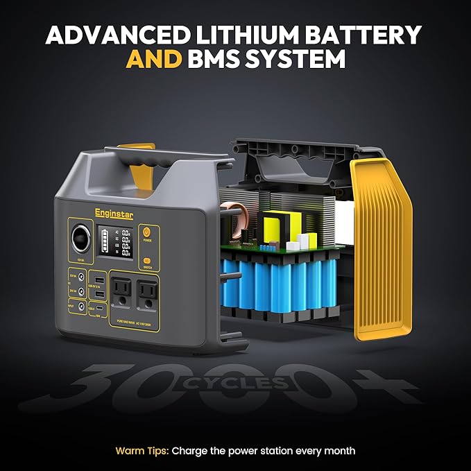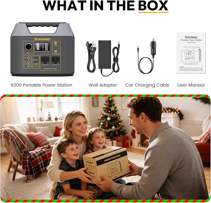 - PORTABLE BUT POWERFUL: 9 x 5.5 x 7.5 inches body size, only 6.5lb, EnginStar 300W portable power station is every compact, built-in LED light and large LCD display, easy to read, EnginStar portable power station provides 296 watt-hours of power usage, sufficient to power for weekend camping trips, road trip, RV living, outdoor off-grid activities, can provide enough juice to charge your phones, laptop, camera, CPAP, drone and more